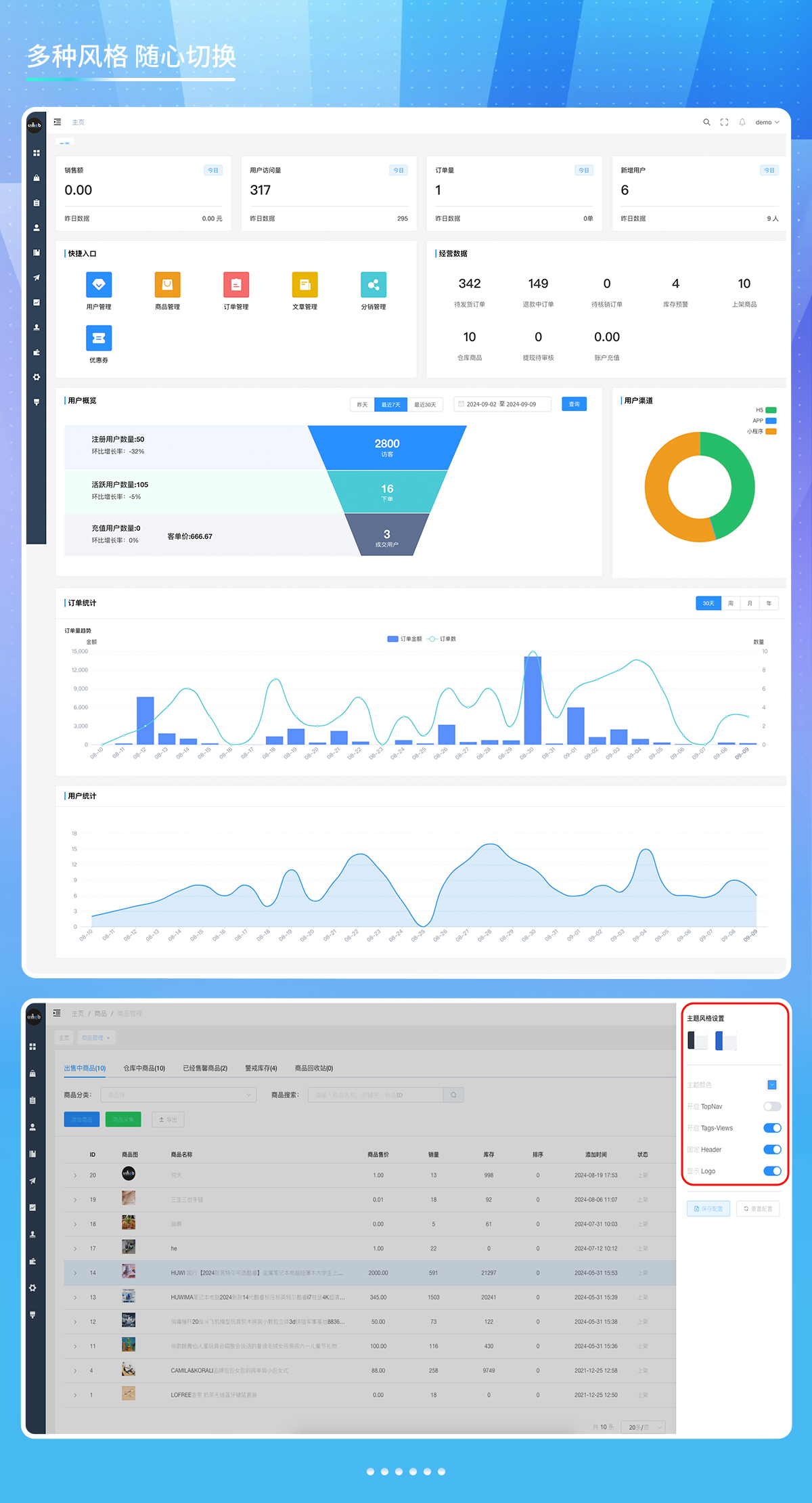 7.数据统计分析,使用ECharts图表统计实现用户、产品、订单、资金等统计分析。